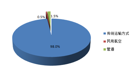 由圖3可知,傳統(tǒng)運輸方式在我國整體貨物運輸中仍然占主要地位。鐵路、公路及水路貨運量共占我國總體貨運量的98%以上。盡管民用航空及管道運輸在近年來發(fā)展迅速,但在我國總體貨運量中占比仍然較小。