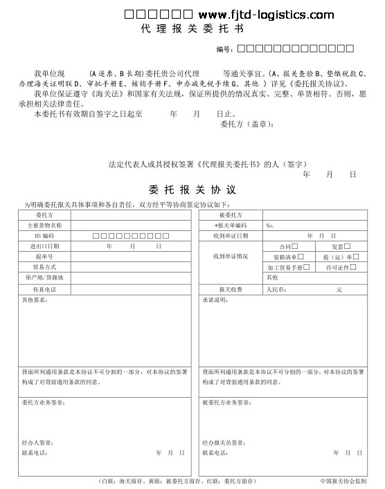 FJTD代理報(bào)關(guān)委托書(樣本下載)