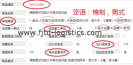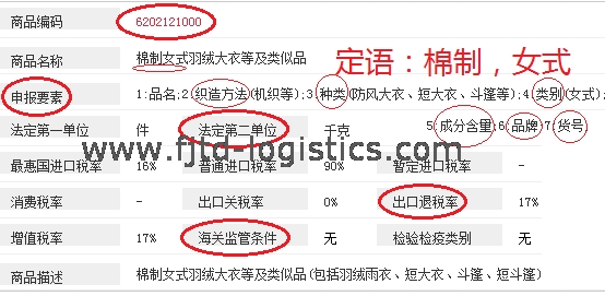 申報(bào)要素:織造方法(機(jī)織/梭織)、種類(lèi)(羽絨服)、類(lèi)別(女式)、成分含量(比如80%棉)、品牌、貨號(hào)。法定第一單位:件,法定第二單位:千克。