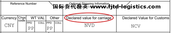 Declared Value for Carriage是運(yùn)輸聲明價值;Declared Value for Customs是海關(guān)聲明價值;NVD是No Value Declared的縮寫,意為沒有聲明價值;NCV是No Customs Valuation的縮寫,意為沒有海關(guān)聲明價值。