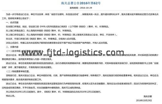本公告自2016年11月1日起施行。其中,《稅則》第84、85、90章商品的試點(diǎn)自2016年12月1日起施行。