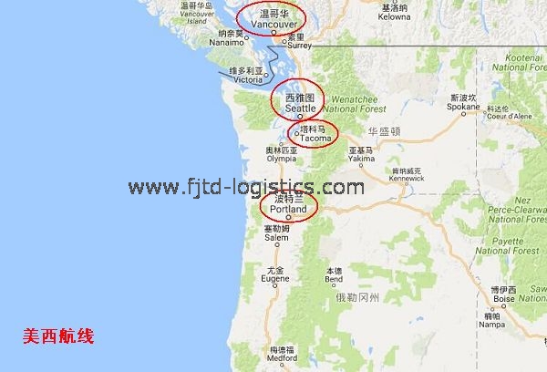 美西航線的主要港口有:Los Angeles洛杉磯;Long Beach長灘;San Francisco舊金山;Portland波特蘭;Seattle西雅圖等。