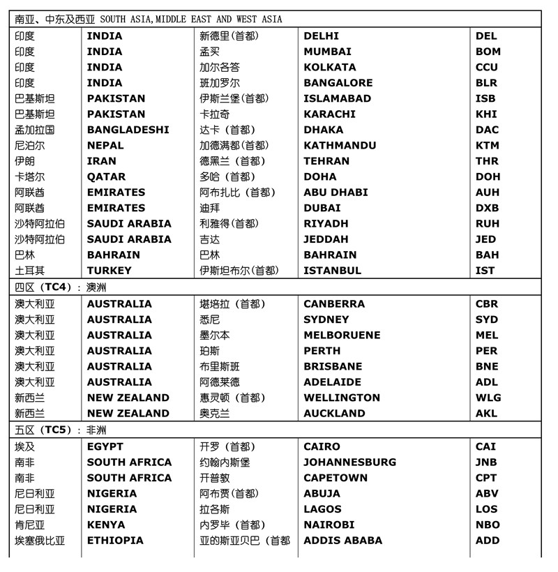 城市也有三字代碼。如:北京的城市碼為BJS——兩個(gè)機(jī)場(chǎng)分別為PEK和NAY;上海的城市碼為SHA——兩個(gè)機(jī)場(chǎng)分別為SHA和PVG;廣州的城市碼為CAN——機(jī)場(chǎng)代碼也是CAN;紐約的城市碼為NYC——4個(gè)機(jī)場(chǎng)分別為EWR、JFK、LGA和SWF;倫敦的城市碼為L(zhǎng)ON——6個(gè)機(jī)場(chǎng)分別為L(zhǎng)HR、LGW、LCY、LTN、STN和SEN等。