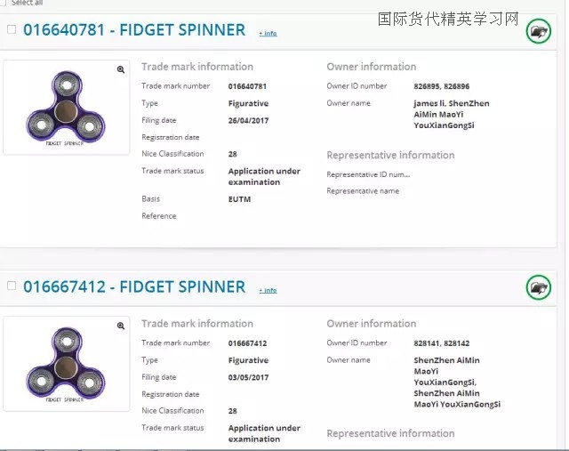當小編今天再次檢索“fidget spinner”這個名稱在中國、歐盟、英國、美國、日本的商標注冊情況,小編驚訝地發(fā)現(xiàn),除了日本是分別申請28類“fidget”和“spinner”兩個商標,中歐美英三國都有“fidget spinner”在申請中,而中國是在今年2月份,提交了“hand spinner”申請。