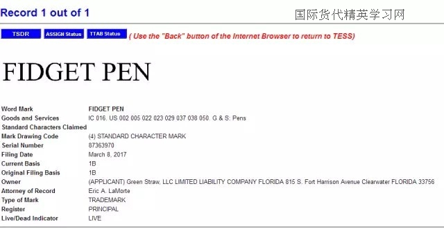 由此可見,美國關于指尖陀螺,無論是發(fā)明專利還是外觀專利,存在侵權(quán)的風險都較低,當然,如果最早的制造商對這款外觀已經(jīng)申請了外觀專利,但是還沒獲準注冊,申請也沒滿18個月,那我們目前是檢索不到的,這樣,這個外觀如果獲準注冊了,估計才會有外觀侵權(quán)的問題!而商標方面,“fidget spinner”目前在申請中,這是一個商標名,即使核準注冊了, 第三方只要不把該產(chǎn)品名詞當作商標使用,是不造成侵權(quán)的。