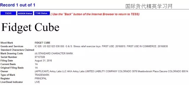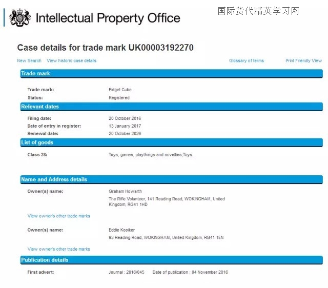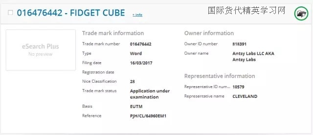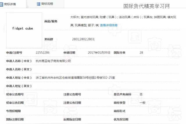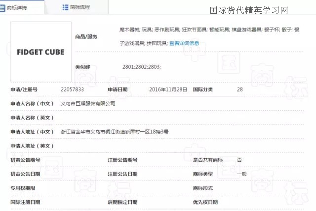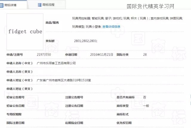 最后,減壓魔方(Fidget Cube),小編查到中國關于fidget cube 商標注冊情況時,瞬間驚呆!從去年11月份到今年1月份,一共有4位申請人提交了fidget cube 申請28類,歐盟和美國也有申請,同一申請人ANTSY Labs. LLC,由此,小編推斷,這款魔方的發(fā)明者很有可能就是這家美國公司,也有可能申請了美國的外觀和發(fā)明!也是在去年下半年,是一名英國人向英國商標局提交了fidget cube 28類的商標申請。截至目前,fidget cube就是在日本沒有檢索到相同的商標申請,但是,日本的商標檢索盲期也有2-3個月,因此,也很難說在3月份到現(xiàn)在是否有人提交了fidget cube 的商標申請!