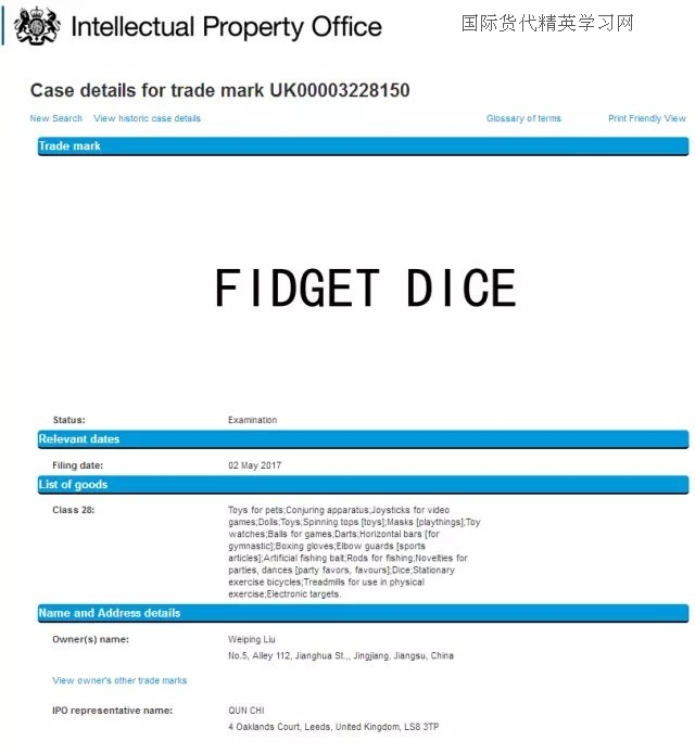方信小編順手研究了一下相關還有沒有類似的商標, 結(jié)果還發(fā)現(xiàn)了一個減壓骰子(fidget dice),就在前幾天,來自江蘇省的朋友向英國商標局申請了fidget dice 28類商標。
