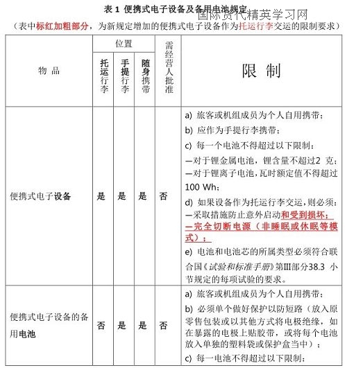 (表中標紅加粗部分,為新規(guī)定增加的便攜式電子設備作為托運行李交運的限制要求)