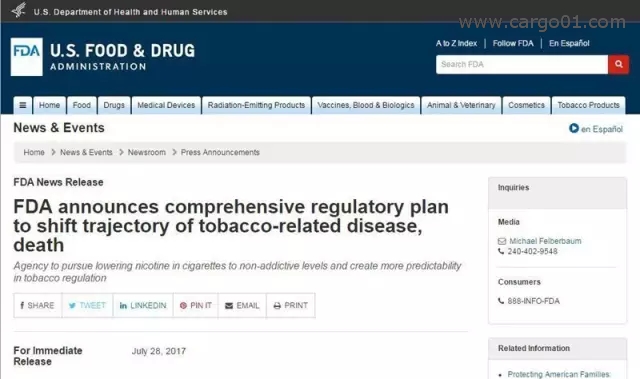 7月28日,美國FDA在官網(wǎng)上發(fā)布公告,宣布了一項新的煙草和尼古丁監(jiān)管綜合計劃,說:“計劃不久發(fā)布一份新的執(zhí)行政策的指南”,推遲電子煙產(chǎn)品的注冊申請時間。