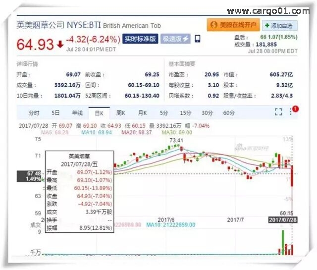 這一公告發(fā)布后,美國和英國主要煙草公司的股價暴跌。萬寶路”香煙生產(chǎn)商、煙草巨頭奧馳亞(Altria)集團股價下跌超過9%,英美煙草下跌7.40%。菲利普莫里斯國際公司下跌1.66%。全球最大煙草生產(chǎn)商的市值損失了大約260億美元。