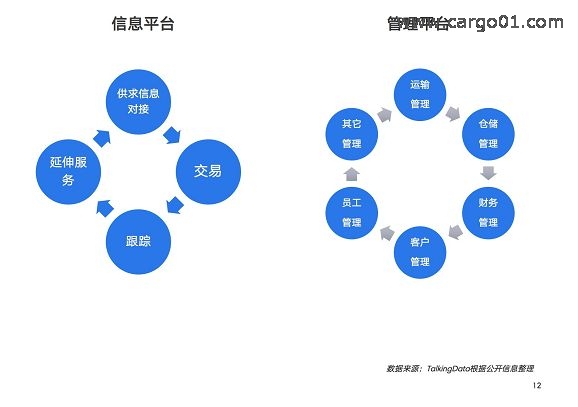 物流平臺(tái)分為兩類(lèi),信息平臺(tái)和管理平臺(tái)。信息平臺(tái)分為物流信息查詢(xún)平臺(tái)和物流信息交易平臺(tái)。查詢(xún)平臺(tái)主要以物流信息查詢(xún)和發(fā)布為主,交易平臺(tái)在查詢(xún)平臺(tái)的基礎(chǔ)上增加買(mǎi)賣(mài)雙方直接交易功能,并且在買(mǎi)賣(mài)雙方交易全程提供配套服務(wù)。 管理平臺(tái)的主體通常是企業(yè)主,管理平臺(tái)的作用主要是合理調(diào)配資源、提高效率等。