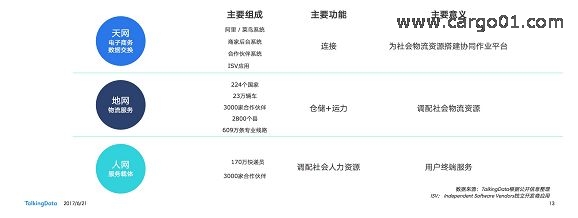 菜鳥(niǎo)物流網(wǎng)可拆分成天網(wǎng)、地網(wǎng)和人網(wǎng)3大版塊。天網(wǎng)是由數(shù)據(jù)驅(qū)動(dòng)的云供應(yīng)鏈協(xié)同平臺(tái),強(qiáng)調(diào)電子商務(wù)及物流數(shù)據(jù)的交互和分享;地網(wǎng)是借由龐大的地面網(wǎng)絡(luò)不斷聚集貨物、人氣,讓天網(wǎng)的數(shù)據(jù)能力落地;人網(wǎng)是主打“最后一公里”物流服務(wù)和基于消費(fèi)者真實(shí)生活中各種場(chǎng)景下的便民服務(wù)。