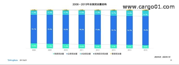 公路運(yùn)輸因其運(yùn)輸?shù)臋C(jī)動(dòng)性,網(wǎng)絡(luò)的廣泛覆蓋等特點(diǎn),一直是多數(shù)貨運(yùn)的首選,隨著市場(chǎng)規(guī)模的不斷擴(kuò)大,基礎(chǔ)設(shè)施也不斷完善,使得公路運(yùn)輸長(zhǎng)期占據(jù)貨運(yùn)量的75%左右;鐵路運(yùn)輸份額持續(xù)下降,水運(yùn)貨運(yùn)持續(xù)上升。