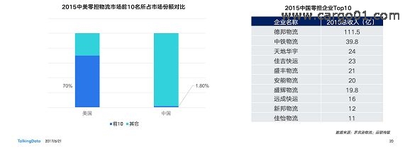 中國(guó)公路運(yùn)輸?shù)钠髽I(yè)有78萬(wàn)家,“小”“散”“亂”“差”是行業(yè)最主要的問(wèn)題。他們經(jīng)常表現(xiàn)為一人一車(chē)一電話的作坊模式。中國(guó)零擔(dān)市場(chǎng)前10名市場(chǎng)份額之和占行業(yè)整體的1.8%,美國(guó)零擔(dān)市場(chǎng)前10市場(chǎng)份額之和卻高達(dá)70%。頭部廠商的市場(chǎng)份額大,有利于充分調(diào)配資源,達(dá)到降低成本提升效率的目的。