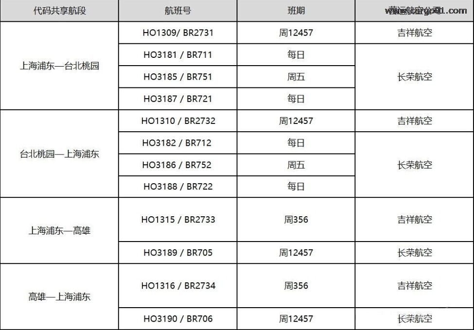 此次吉祥航空與長榮航空在上海浦東—臺(tái)北桃園和上海浦東—高雄航線的代號(hào)共享合作具體如下: