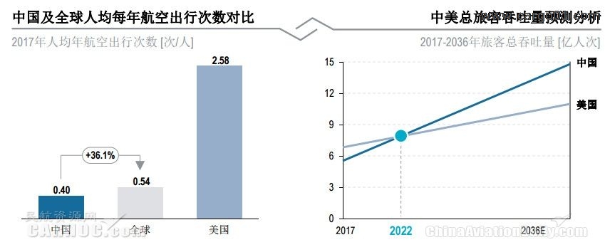 但是,我們會(huì)看到,其實(shí)這里面如果平均到中國的單人次的話,我們中國現(xiàn)在每年平均人出行,就是13億人口平均下來的話,每人、每年的出行可能也就有0.4次。全球的平均水平是0.54次。如果我們?cè)倌帽容^發(fā)達(dá)的美國市場(chǎng)去做對(duì)比的話,它們的人均是2.58次,所以可以見到這里面的差距,或者從另外的一個(gè)角度來說這里面的潛力還是非常巨大的。隨著我們?nèi)司鲂械奶嵘覀冾A(yù)測(cè),其實(shí)中國可能在2022年就會(huì)超過美國,成為全球最大的單一航空市場(chǎng)。