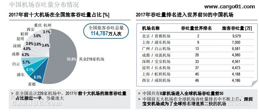 我們正式公布了229個(gè)機(jī)場(chǎng)的數(shù)據(jù),在這個(gè)里面我們會(huì)看到頭部的集中還是非常明顯的。以首都機(jī)場(chǎng)為代表,我們?cè)赑PT的左邊把前10大機(jī)場(chǎng)畫出來。他們的總量其實(shí)占了整個(gè)中國機(jī)場(chǎng)吞吐量將近半壁江山。