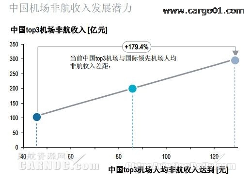 我們剛才講到的三個(gè)頭部機(jī)場(chǎng):浦東、首都機(jī)場(chǎng)、白云機(jī)場(chǎng),這三個(gè)平均數(shù)據(jù)用最左邊藍(lán)點(diǎn)表示,最右邊淺藍(lán)色是一些國際領(lǐng)先的。我們會(huì)看到,如果在這方面獲得提升,這三個(gè)機(jī)場(chǎng)的非航收入提升潛力非常大。如果是跟國際水平比,現(xiàn)在人均46元,實(shí)現(xiàn)總非航收入一年大概107億元,我們跟國際差距縮小一半,基本上實(shí)現(xiàn)翻倍。如果是完全達(dá)到現(xiàn)在國際的領(lǐng)先水平,在我們現(xiàn)在非航收入水平上,基本上達(dá)到一個(gè)額外2倍,總的3倍的增長(zhǎng)。