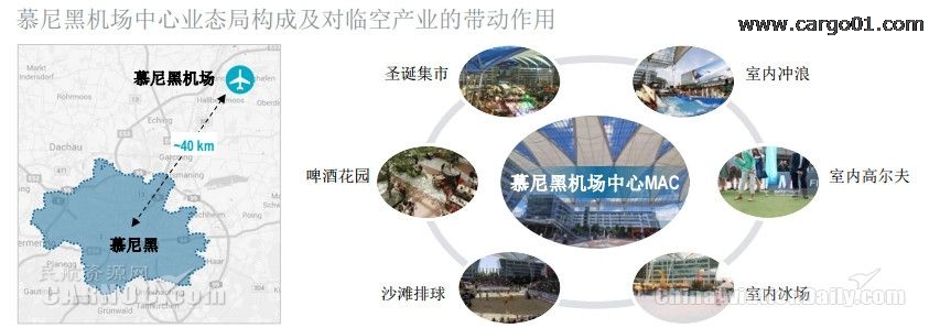另外一個(gè)例子,整個(gè)機(jī)場(chǎng)里面如果有土地資源或者有更多的設(shè)施改造建設(shè)的能力,這個(gè)題材更加廣泛。我們這里面舉了一個(gè)例子:慕尼黑機(jī)場(chǎng)。右邊這個(gè)圖中間圓圈,慕尼黑中心有一個(gè)MAC是綜合體,打造了歐洲最大的機(jī)場(chǎng)室內(nèi)公共空間,每到夏天的時(shí)候,這里面人工運(yùn)來很多沙子,打造成一個(gè)人工沙灘。冬天圣誕節(jié)前夕是一個(gè)集市,這個(gè)空間里面每年舉行主題活動(dòng)。有很多人并不是航空乘客,功能甚至是拓展到機(jī)場(chǎng)周邊的居住社區(qū)。所以在慕尼黑機(jī)場(chǎng),周圍很多居住的居民,會(huì)把這個(gè)地方當(dāng)成整個(gè)城市生活里面非常重要的活動(dòng)場(chǎng)地。在這里實(shí)現(xiàn)了一些非常好的收入和創(chuàng)收。