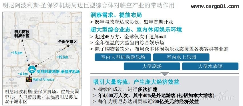 商業(yè)角度再舉一個(gè)例子,美國明尼阿波利斯機(jī)場(chǎng)打造了一個(gè)Mall of America,從1986年與政府達(dá)成協(xié)議開始,1992年首期開業(yè),現(xiàn)在一直在建設(shè),體量規(guī)模在全球范圍內(nèi)僅次于迪拜mall。它離機(jī)場(chǎng)有4公里的距離,但是發(fā)展成為全美最大的購物中心。這里面有40%的客流來自于外地,這個(gè)mall里面有綜合型設(shè)施,像樂高商店、游樂園、水族館等等。有很多人專門到這個(gè)項(xiàng)目里來,帶動(dòng)了機(jī)場(chǎng)。