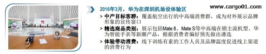 第四:客群深研定向聚焦。中國大型機(jī)場(chǎng)其實(shí)有相當(dāng)大的流量是國內(nèi)航段,這里面也沒有免稅的福利等等,非航的激活如何去做?這里面舉了兩個(gè)例子,機(jī)場(chǎng)本身對(duì)于航空出行完成了一個(gè)天然篩選,航空乘客消費(fèi)能力、意愿是比較高的。在深圳機(jī)場(chǎng),華為公司在深圳機(jī)場(chǎng)的入口處,非常好的一個(gè)地段,設(shè)立了一個(gè)展示店。