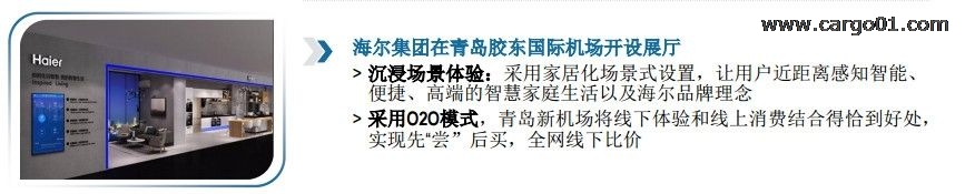 其實(shí)從另外一個(gè)角度,這種乘客其實(shí)還有巨大的消費(fèi)精力,而且有很多商務(wù)客平時(shí)很忙,在機(jī)場(chǎng)反倒是難得的有一點(diǎn)個(gè)人空閑時(shí)間去想一點(diǎn)個(gè)人事情,或者是滿足一些個(gè)人消費(fèi)愿意,這時(shí)機(jī)場(chǎng)是一個(gè)非常好的窗口。這里面還有一個(gè)例子,是海爾集團(tuán)在機(jī)場(chǎng)的一個(gè)旗艦店,智能家電的一個(gè)全場(chǎng)景的呈現(xiàn)。
