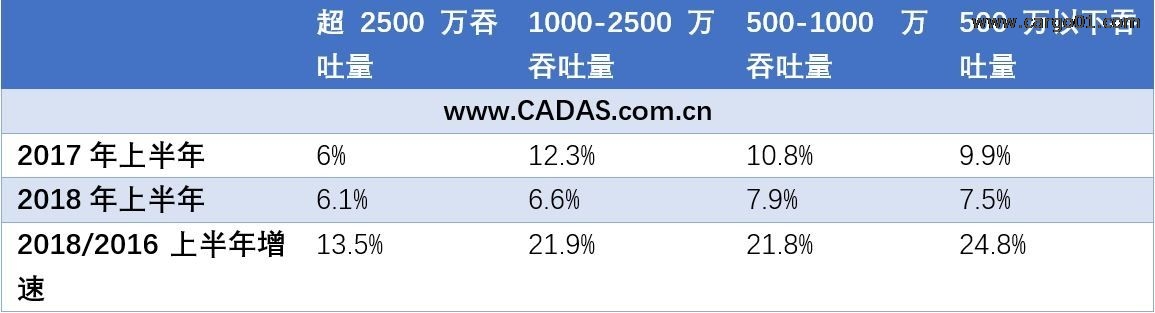 從不同規(guī)模機(jī)場吞吐量增速觀察,2500萬吞吐量以下機(jī)場增速明顯放緩。但500-1000萬吞吐量、1000萬-2500萬吞吐量規(guī)模機(jī)場增速持續(xù)保持領(lǐng)先。若對比2016年同期,可以觀察到中小機(jī)場明顯增長更快。吞吐量超過2500萬機(jī)場增速低于1000-2500萬吞吐量機(jī)場,一方面,反映出大型航空樞紐趨于飽和,另一方面,也反映出中等規(guī)模機(jī)場受低成本航空驅(qū)動所帶來的變化。