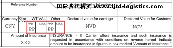 如果運(yùn)費(fèi)和聲明價值附加費(fèi)預(yù)付,就在WT VAL下的PPD一欄填寫PP。