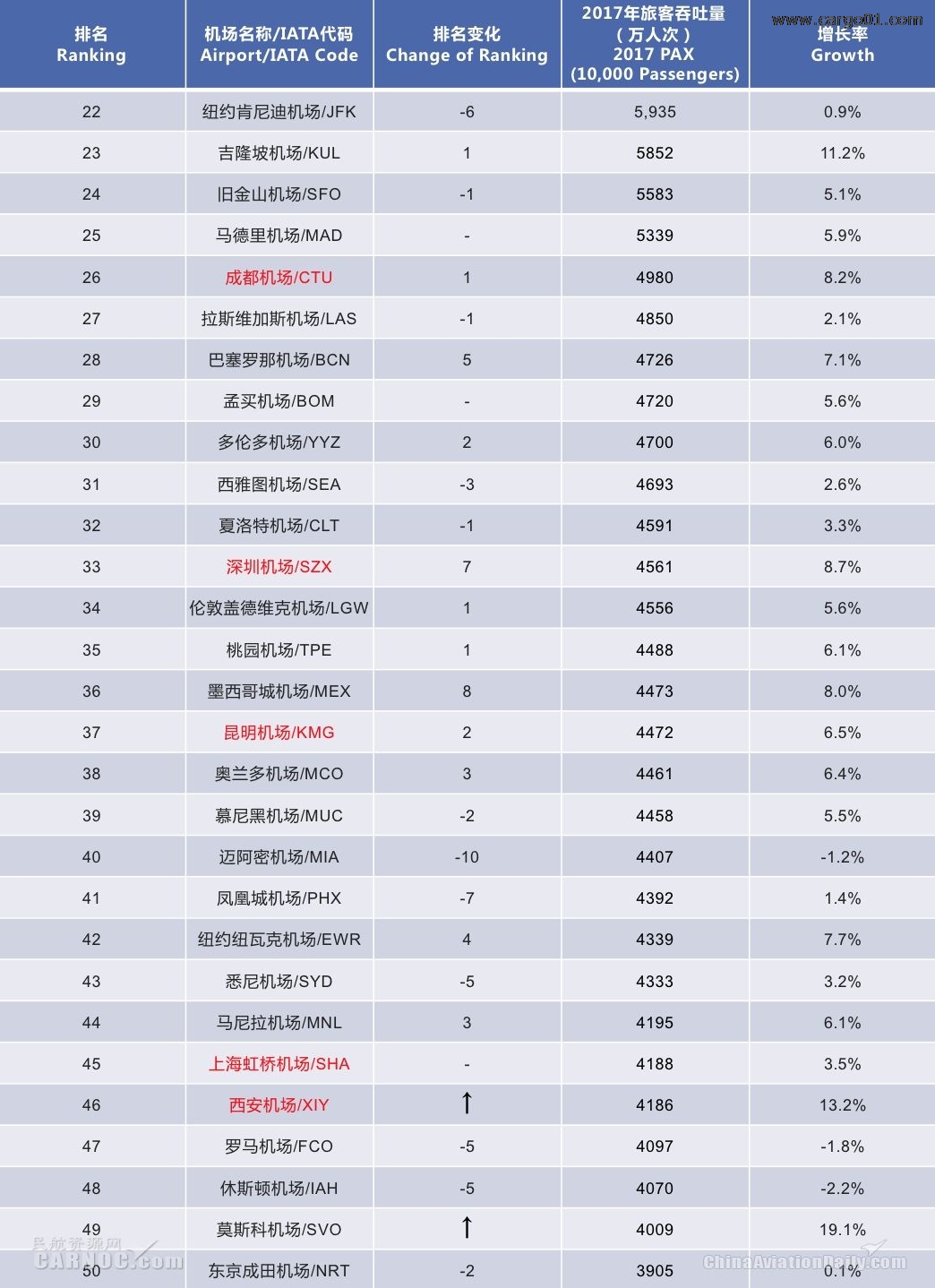 CADAS:2017年全球機(jī)場(chǎng)吞吐量TOP50出爐