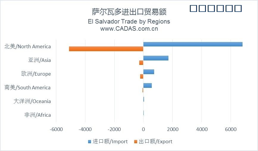 其國內(nèi)經(jīng)濟(jì)以農(nóng)業(yè)為主,工業(yè)基礎(chǔ)薄弱。亞洲是繼北美后塞爾瓦多第二大進(jìn)行進(jìn)出口貿(mào)易的地區(qū)。而在所有亞洲國家中,塞爾多瓦對(duì)中國的進(jìn)口貿(mào)易額占50%、出口貿(mào)易額占16%。早在2017年薩爾瓦多就表現(xiàn)出與中國尋求貿(mào)易發(fā)展的傾向。